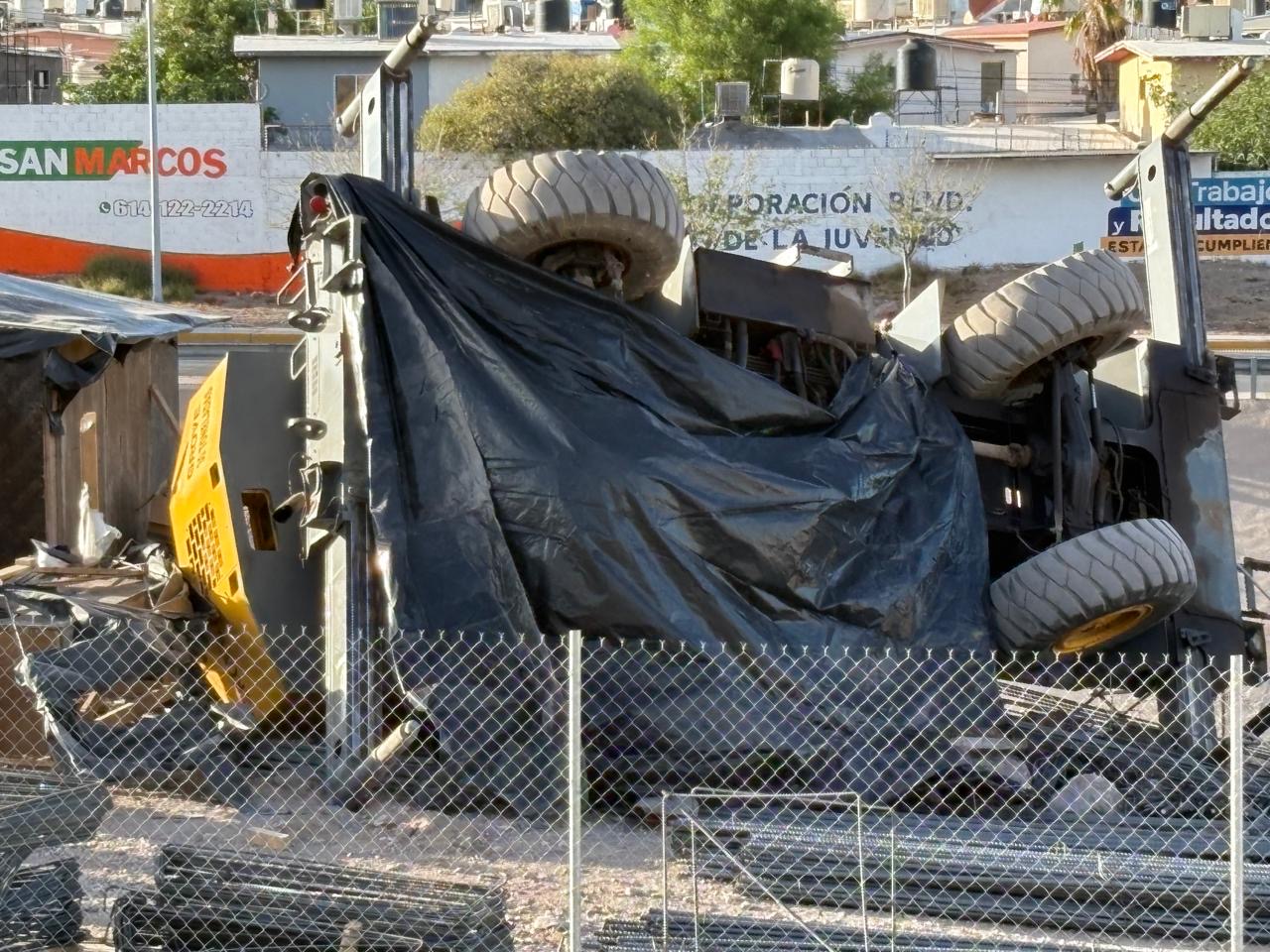 Una grúa tipo pluma con capacidad de 30 toneladas volcó mientras realizaba maniobras de descarga de varilla en la avenida Teófilo Borunda Sur, frente al Parque Acueducto.