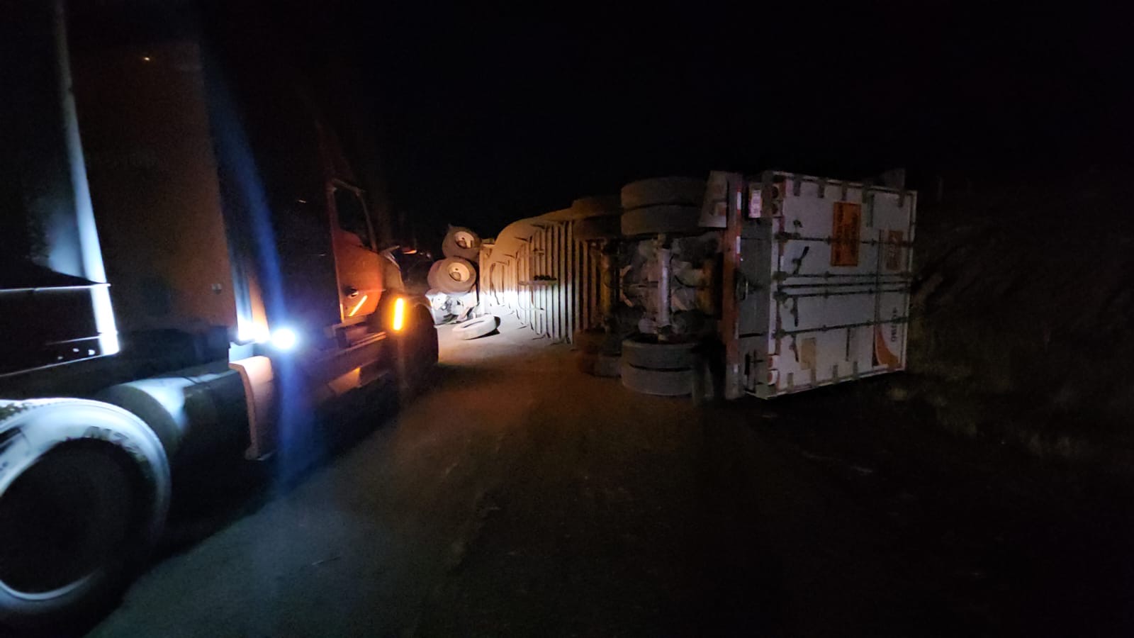 La unidad, perteneciente a la empresa Travel Circular y enganchada a un doble semirremolque, perdió el control por causas aún no determinadas, lo que provocó que el segundo remolque volcara. La pesada estructura quedó recostada sobre su costado derecho, invadiendo el carril de extrema derecha.