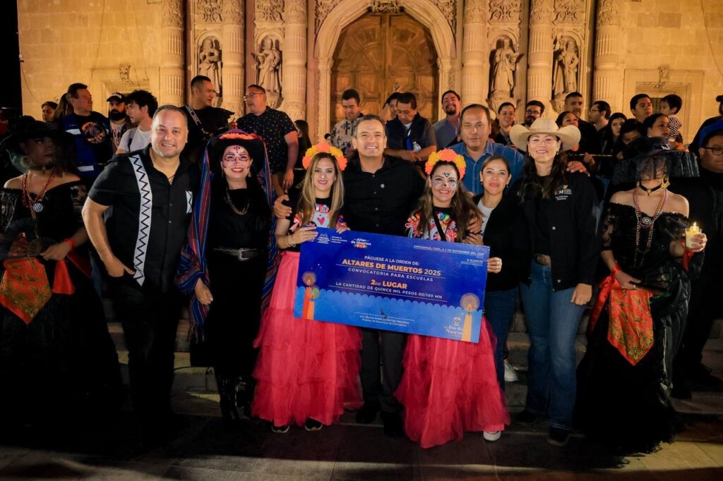 *_H. Ciudad de Chihuahua, Chih., a 3 de noviembre de 2025_*.- Como parte del festival por el Día de Muertos “El Regreso de las Ánimas”, el alcalde Marco Bonilla realizó la noche de ayer en la Plaza de Armas, la premiación a las escuelas ganadoras del concurso de altares de muertos 2025 en el que participaron escuelas de nivel básico, media superior y superior del municipio.