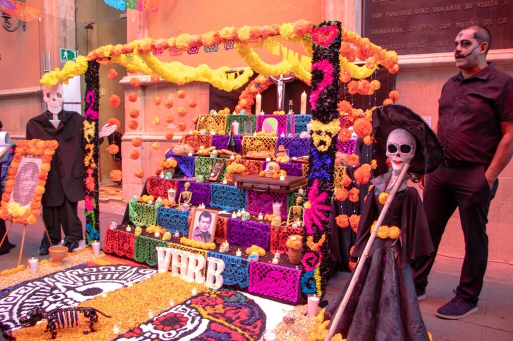 Luego, en la Plaza de Armas los visitantes pudieron tomar fotos en toda la decoración montada por el Instituto de Cultura del Municipio, visitar el Altar de Muertos de la Presidencia Municipal dedicado al conserje de la ciudad, Francisco Alonso y presenciar los bailables que compañías de danza ofrecieron al público frente a Catedral.