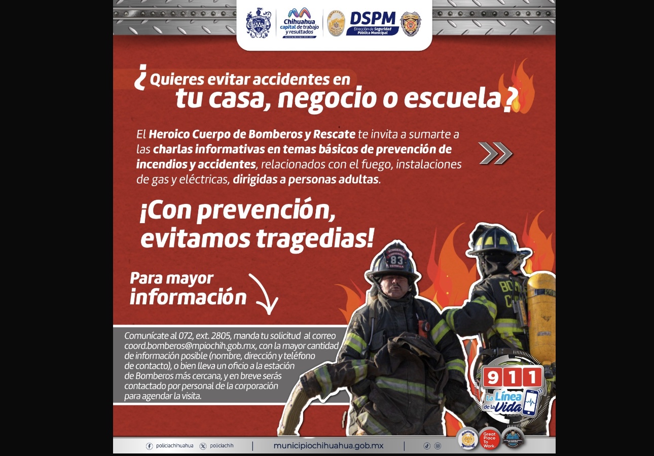 Quienes deseen recibir mayor información sobre cómo solicitar estas valiosas capacitaciones, pueden comunicarse al 072, extensión 2805, mandar su solicitud al correo: coord.bomberos@mpiochih.gob.mx, con la mayor cantidad de información posible (nombre, dirección y teléfono de contacto), o bien llevar un oficio a la estación de Bomberos más cercana, y en breve serán contactados por personal de la corporación para agendar la visita.