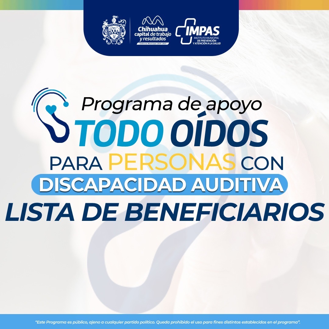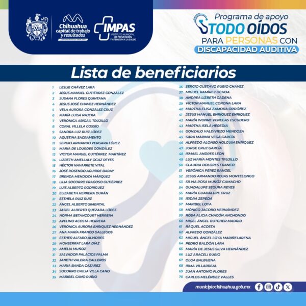 _*H. Ciudad de Chihuahua, Chih., a 28 de mayo de 2025.-*_ El Gobierno Municipal, a través del Instituto Municipal de Prevención y Atención a la Salud (IMPAS), da conocer los beneficiaros de 70 aparatos auditivos que se entregarán como parte del programa “Todo Oídos” edición 2025.