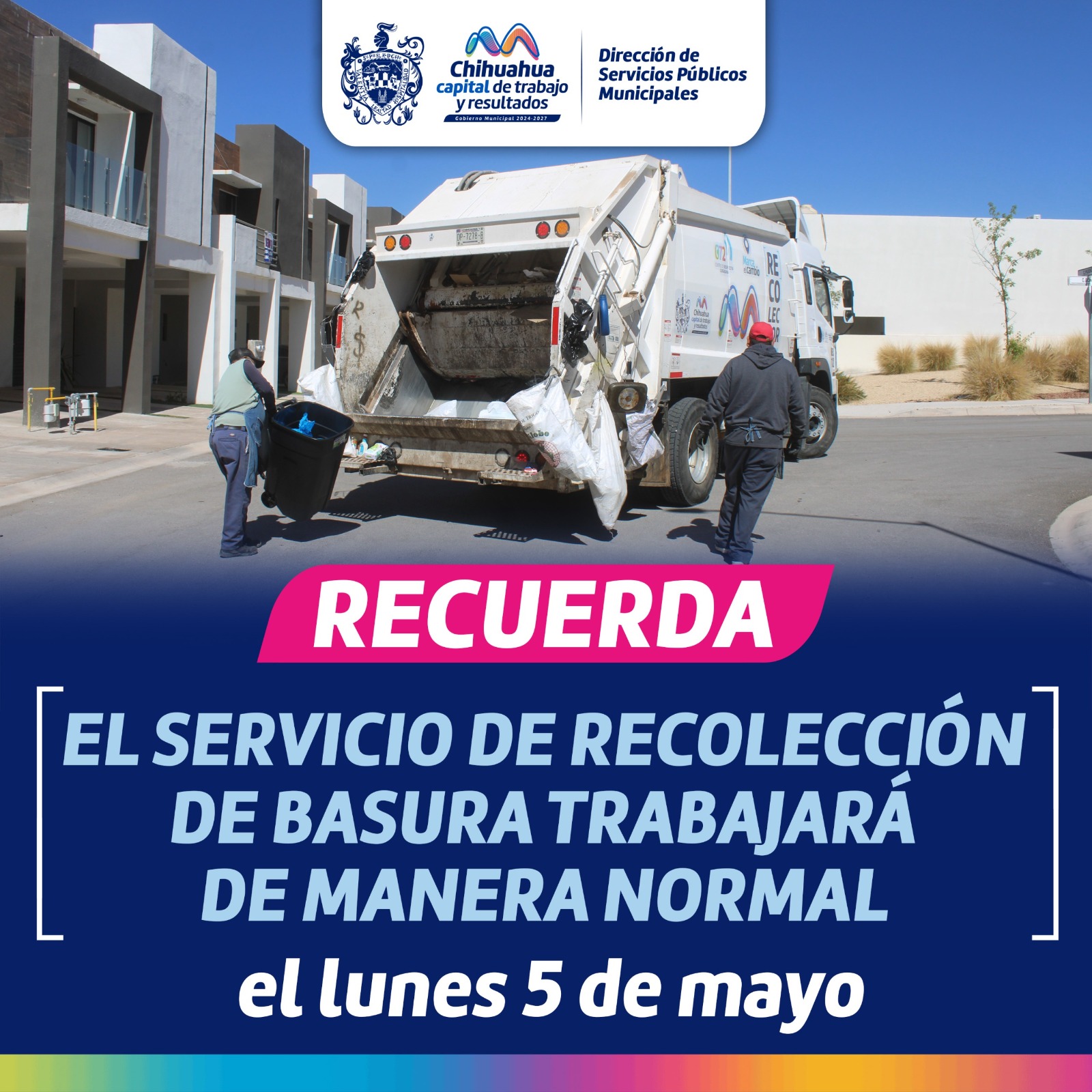*H. Ciudad de Chihuahua, Chih., a 2 de mayo de 2025.-*_ El Gobierno Municipal, a través de la Dirección de Servicios Públicos Municipales, le recuerda a la ciudadanía en general que el próximo lunes 5 de mayo el servicio de recolección de basura habitacional se realizará de manera regular.