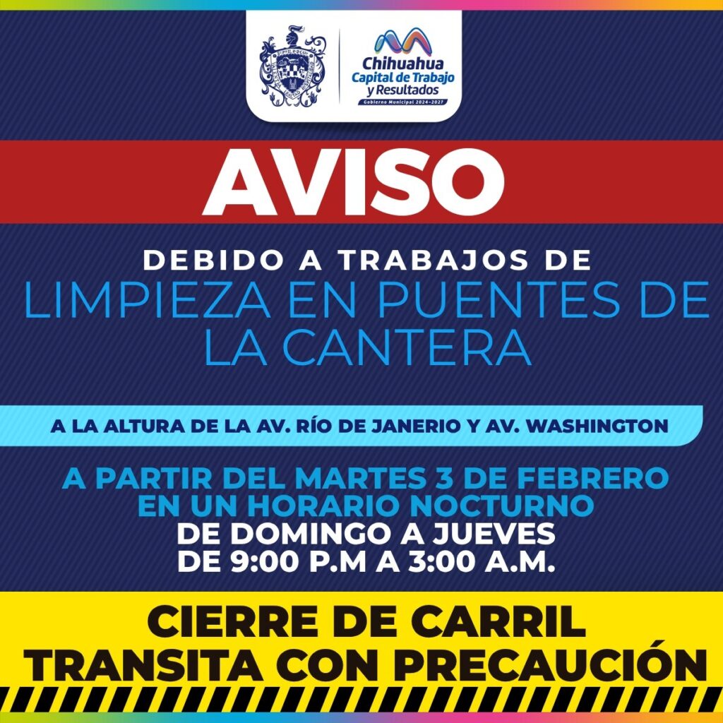 H. Ciudad de Chihuahua, Chih., a 10 de febrero de 2026.- El Gobierno Municipal, a través de la Dirección de Mantenimiento Urbano, continúa con labores nocturnas de limpieza en dos puentes de la avenida La Cantera en dos intersecciones con las avenidas: Río de Janeiro y Washington.