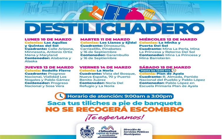 Chihuahua, Chih. A 8 de marzo de 2025.- Para evitar acumulaciones de basura de grandes dimensiones en las viviendas, que podría generar plagas o problemas de salud, el Gobierno Municipal, a través de la Dirección de Servicios Públicos Municipales, informa el calendario del programa Destilichadero, que se realizará del 10 al 15 de marzo en siete colonias de la Capital.