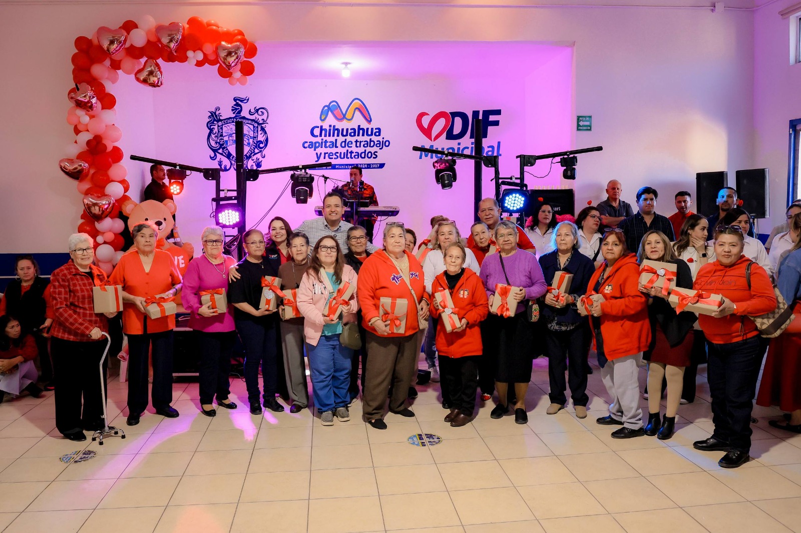 H. Ciudad de Chihuahua, Chih., a 20 de febrero de 2026.- El alcalde de Chihuahua, Marco Bonilla, acompañado de su esposa Karina Olivas, presidenta del DIF Municipal, asistió al “Baile de Corazones” organizado en el Centro Comunitario de Ranchería Juárez, donde convivió con integrantes de los clubes del abuelo de la zona sur de la ciudad, quienes disfrutaron de una tarde llena de música, baile y celebración con motivo del Día de San Valentín.