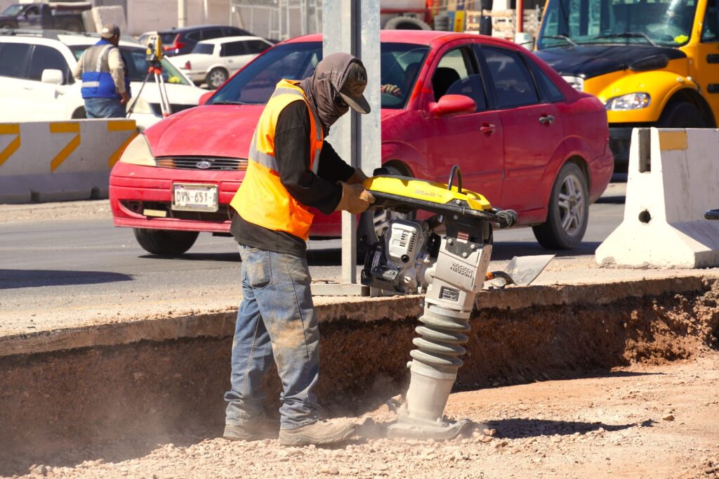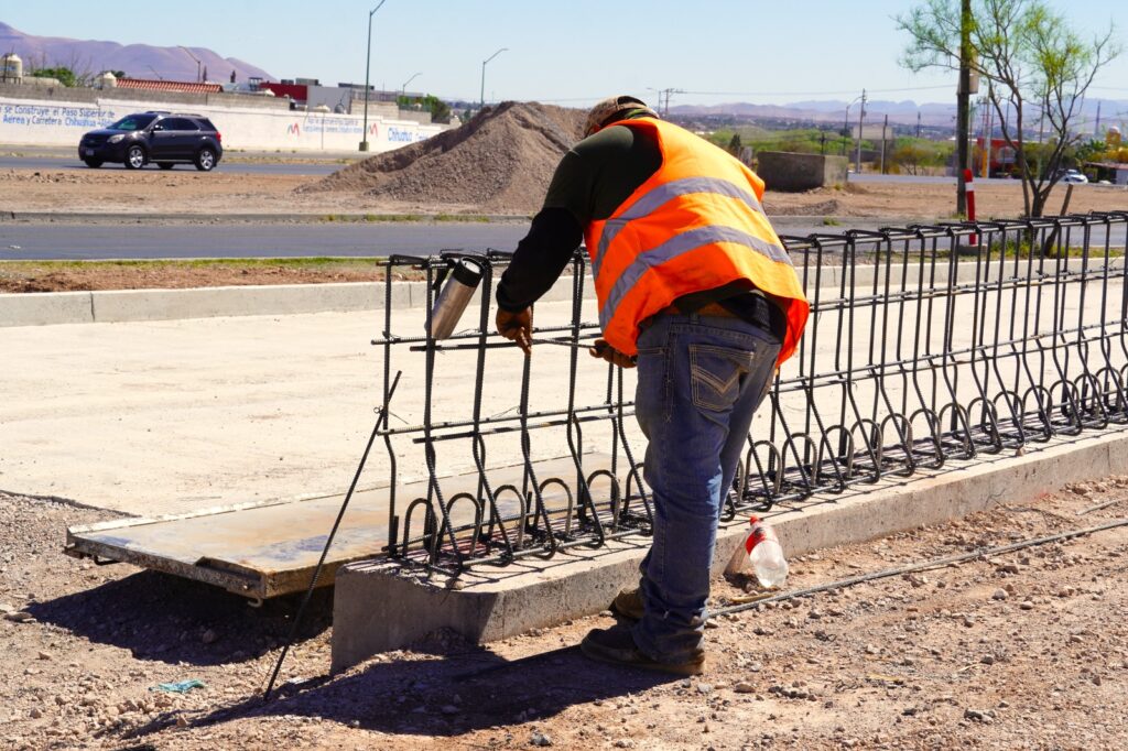 Actualmente, las cuadrillas trabajan en el armado y colado de cabezales en columnas, el colado de remate en el muro ubicado del lado Chihuahua, así como en el colado de concreto en diferentes secciones de la glorieta. Además, se realiza el tendido de base en la rampa instalada en dirección hacia Aldama.