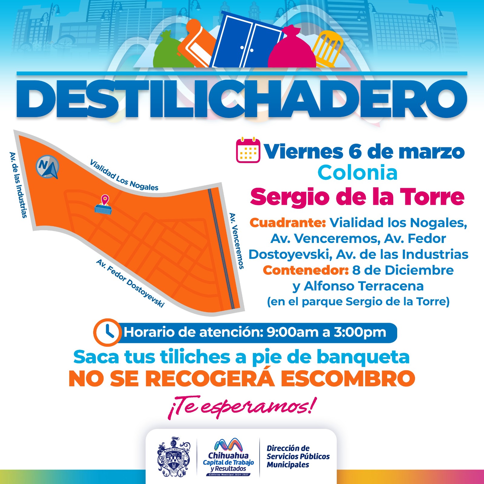 H. Ciudad de Chihuahua, Chih., a 3 de marzo de 2026.- El Gobierno Municipal, a través de la Dirección de Servicios Públicos Municipales, informa a la ciudadanía el cambio de colonia en el programa Destilichadero para este viernes 6 de marzo, el cual se tenía contemplado estuviera en la colonia Infonavit Nacional y se cambiará a la colonia Sergio de La Torre.