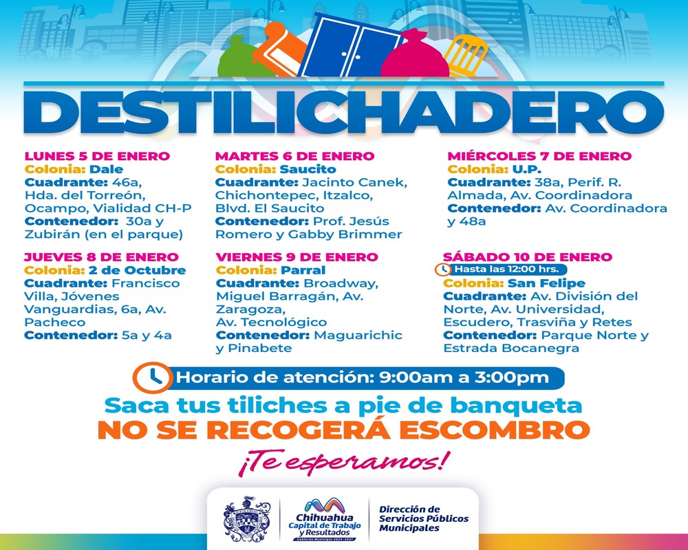 H. Ciudad de Chihuahua, Chih., a 3 de enero de 2026.- Para evitar acumulaciones de basura de grandes dimensiones en las viviendas, que podría generar plagas o problemas de salud, el Gobierno Municipal, a través de la Dirección de Servicios Públicos Municipales, informa el calendario del programa Destilichadero, que se realizará en seis colonias de la capital del del 5 al 10 de enero