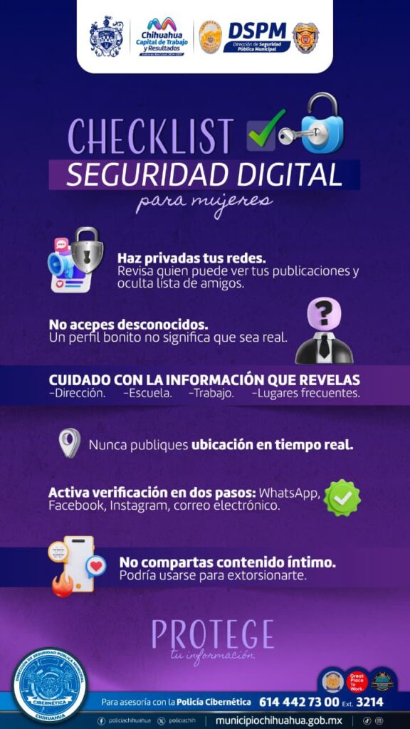 H. Ciudad de Chihuahua, Chih., a 7 de marzo de 2026.- La Dirección de Seguridad Pública Municipal (DSPM), a través de la Policía Cibernética, hace un llamado a las mujeres para reforzar su seguridad en redes sociales y evitar ser víctimas de delitos digitales como la sextorsión y la extorsión.
