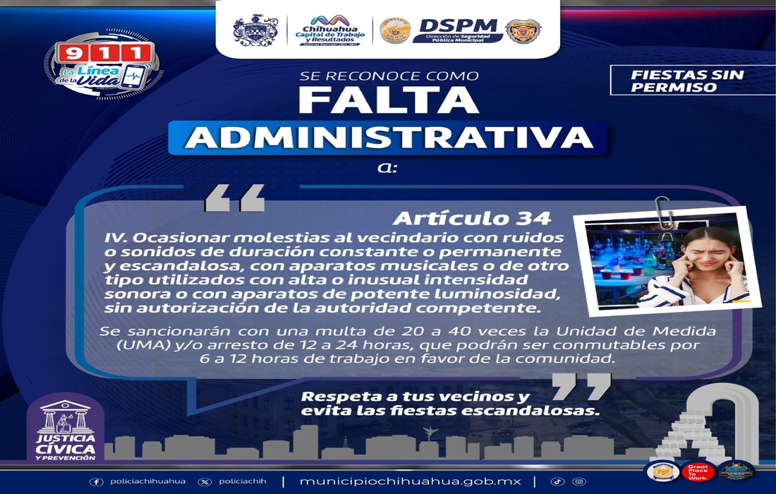 El policía segundo Iván Martínez dio a conocer que las fiestas escandalosas constituyen una falta administrativa que se contempla en el Reglamento de Justicia Cívica del Municipio de Chihuahua donde se establecen sanciones económicas o arrestos en los centros de detención municipal.