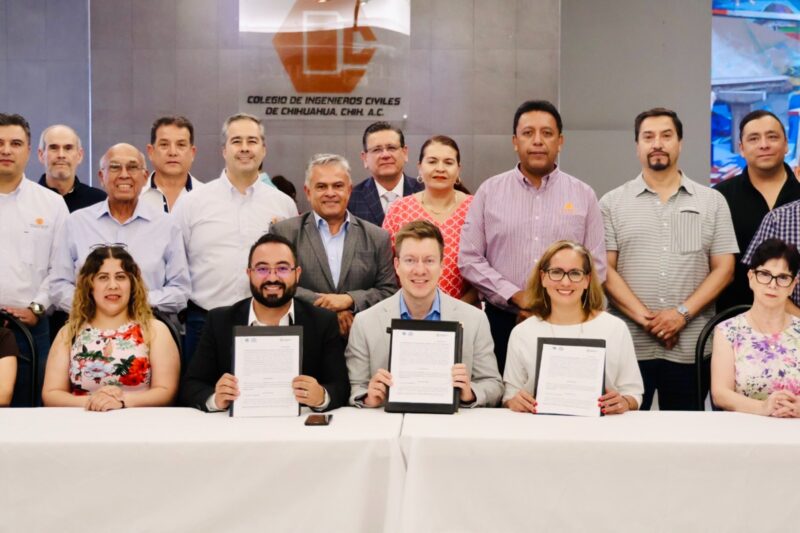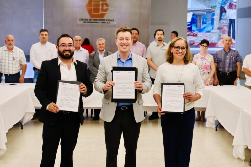 H. Ciudad de Chihuahua, Chih., a 20 de junio de 2025.- En representación del alcalde Marco Bonilla, el Secretario del Ayuntamiento, Roberto Fuentes, encabezó la firma de un convenio de colaboración entre el Gobierno Municipal y el Colegio de Ingenieros Civiles de Chihuahua A.C., con el objetivo de fortalecer la capacitación técnica y el trabajo conjunto en materia de protección civil.