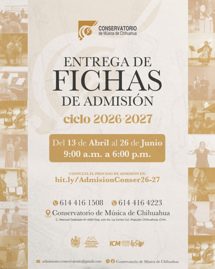 H. Ciudad de Chihuahua, Chih., a 9 de abril de 2026.– El Gobierno Municipal de Chihuahua informa que, a través del Conservatorio de Música, se llevará a cabo la entrega de fichas para el proceso de admisión del ciclo 2026, del 13 de abril al 26 de junio, beneficiando a niñas, niños, jóvenes y adultos interesados en la formación musical, lo que fortalece el acceso a la educación artística y consolida el desarrollo cultural en la ciudad.