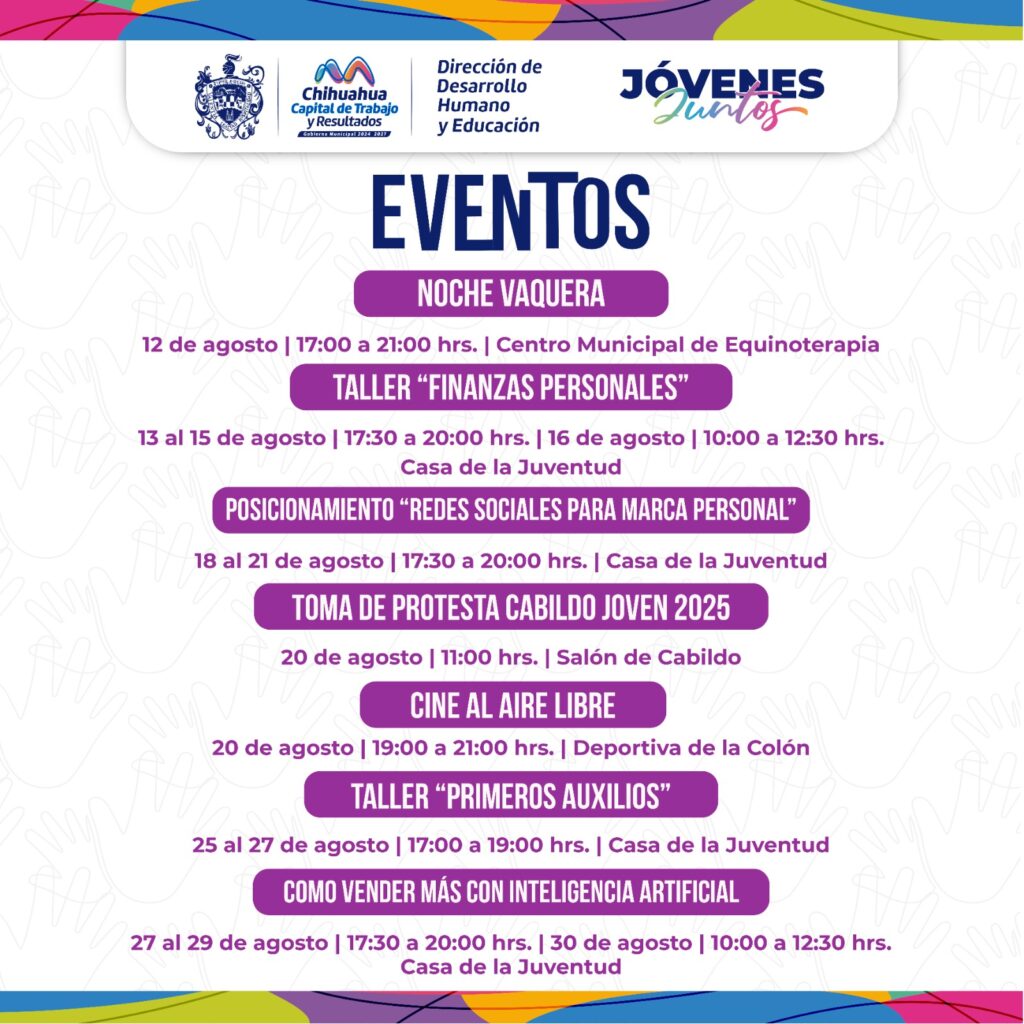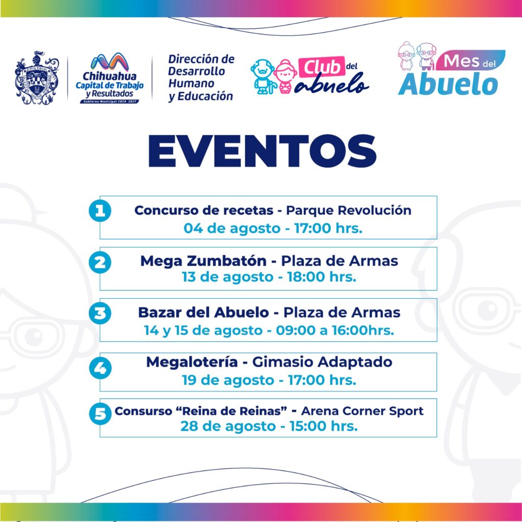 H. Ciudad de Chihuahua, Chih., a 1 de agosto de 2025.- El Gobierno Municipal, a través de la Dirección de Desarrollo Humano y Educación, dio a conocer las actividades que se tendrán este agosto como parte de la celebración del Mes del Abuelo y el Mes de la Juventud.