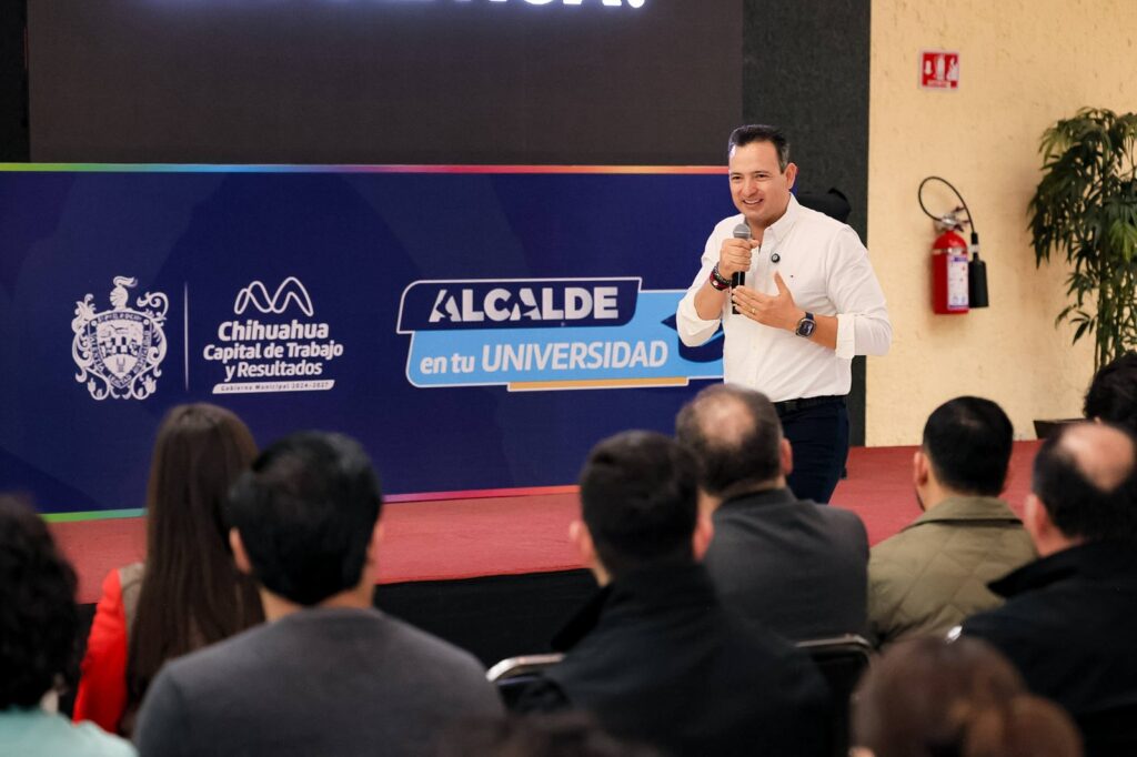 H. Ciudad de Chihuahua, Chih., a 18 de febrero de 2026.- En el marco del programa “Alcalde en tu Universidad”, el presidente municipal Marco Bonilla visitó la Facultad de Contaduría y Administración de la Universidad Autónoma de Chihuahua (UACH), donde dialogó con estudiantes sobre los retos de la política actual, los avances del Gobierno Municipal en materia de seguridad, desarrollo económico y educación, así como la importancia de que las y los jóvenes se involucren activamente en la toma de decisiones de la ciudad.
