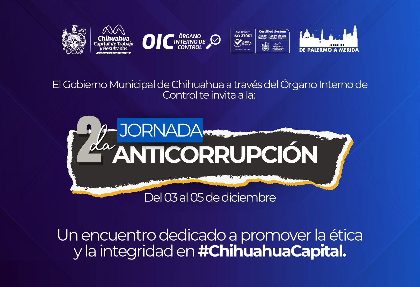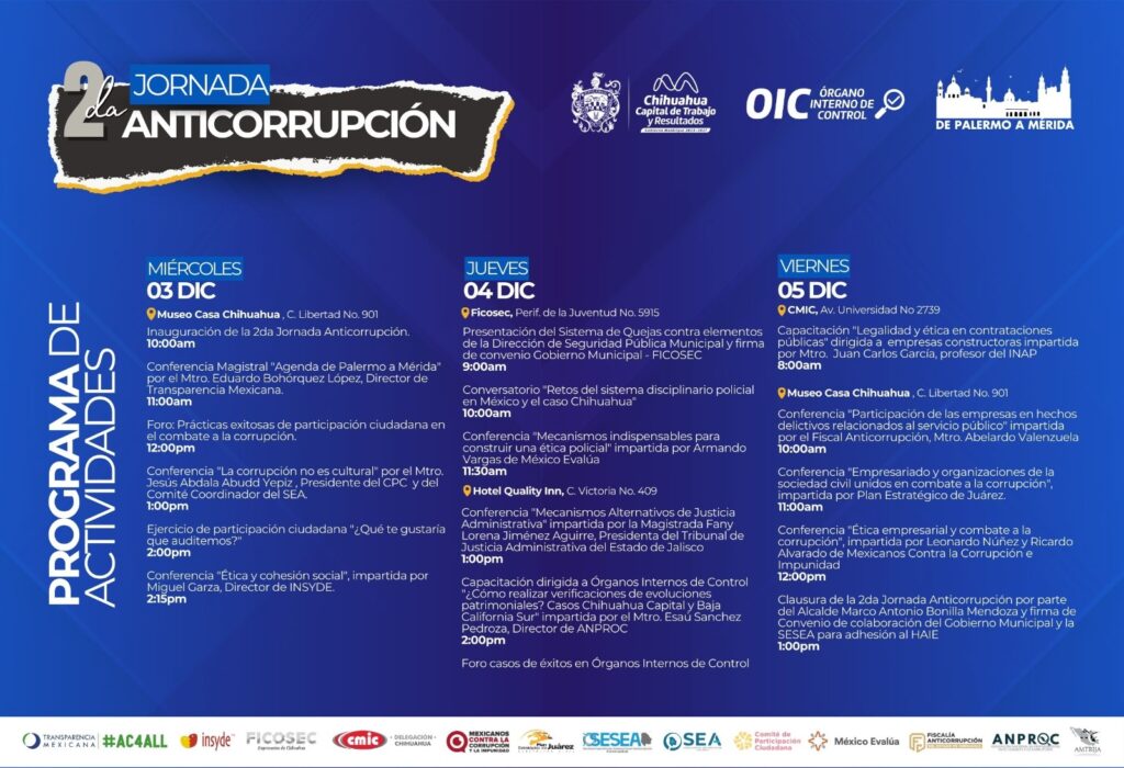H. Ciudad de Chihuahua, Chih., a 24 de noviembre de 2025.- El Gobierno Municipal de Chihuahua, a través del Órgano Interno de Control, invita a la ciudadanía a participar en la Segunda Jornada Anticorrupción, donde habrá diversas conferencias, foros y capacitaciones, herramientas que busca fortalecer la transparencia, la legalidad y el control preventivo dentro del servicio público.