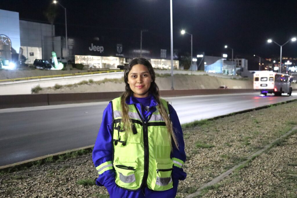 Sonia forma parte de la cuadrilla nocturna de limpieza de vialidades y es la única mujer dentro de su equipo. Su jornada inicia a las 9:00 de la noche y concluye alrededor de las 3:00 de la mañana.