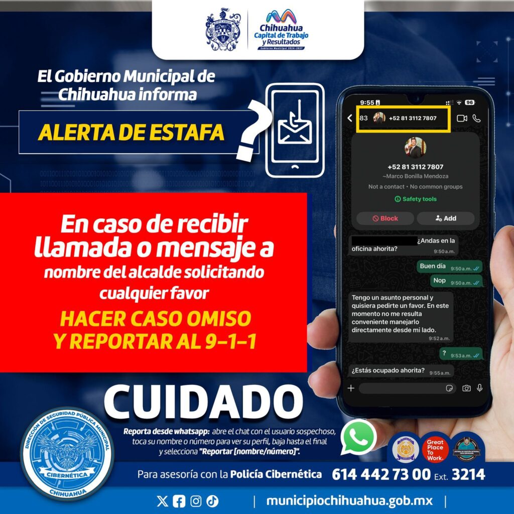 H. Ciudad de Chihuahua, Chih., a 18 de abril de 2026.- El Gobierno Municipal alerta a la ciudadanía sobre la circulación de dos números telefónicos falsos que, a través de WhatsApp, se hacen pasar por el alcalde Marco Bonilla para solicitar favores, lo cual es completamente falso.