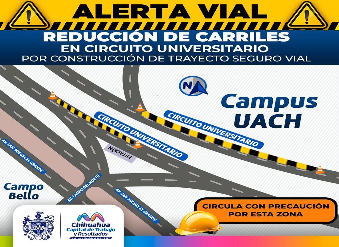 H. Ciudad de Chihuahua, Chih., a 3 de octubre de 2025.-El Gobierno Municipal a través de la Dirección de Obras Públicas, emite una alerta vial por la reducción de carriles en el Circuito Universitario a la altura de la Facultad de Ingeniera de la UACH, en el sentido sur-norte debido a los trabajos de demolición de asfalto para la construcción de un paso peatonal pompeyano, como parte de la obra denominada Trayecto Vial Seguro.