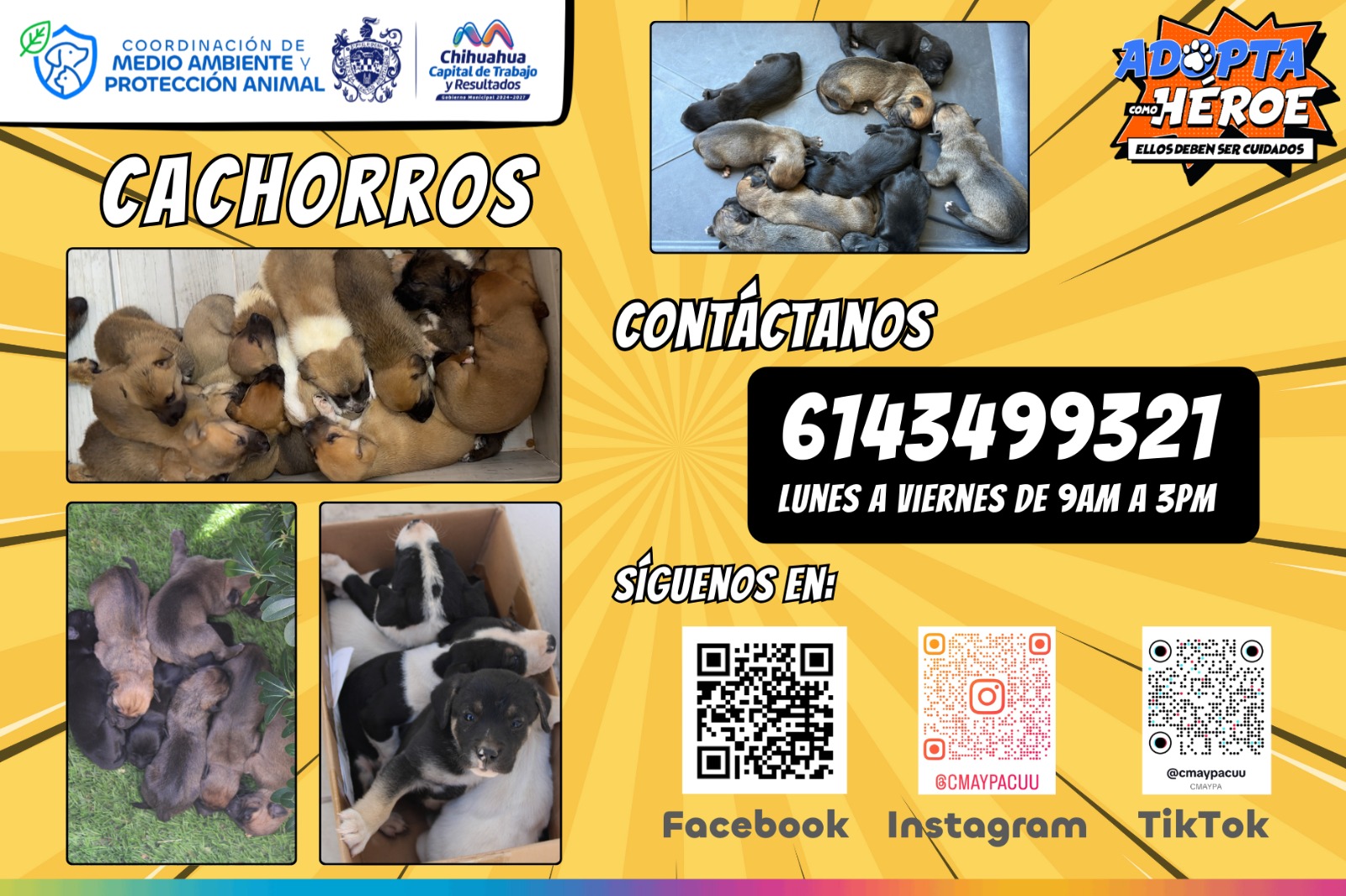 H. Ciudad de Chihuahua, Chih., a 11 de marzo de 2026.- El Gobierno Municipal de Chihuahua, a través de la Coordinación de Medio Ambiente y Protección Animal, mantiene activa su campaña permanente de adopción responsable, con el objetivo de que más perritos rescatados encuentren un hogar seguro donde puedan vivir con cuidado, respeto y cariño.