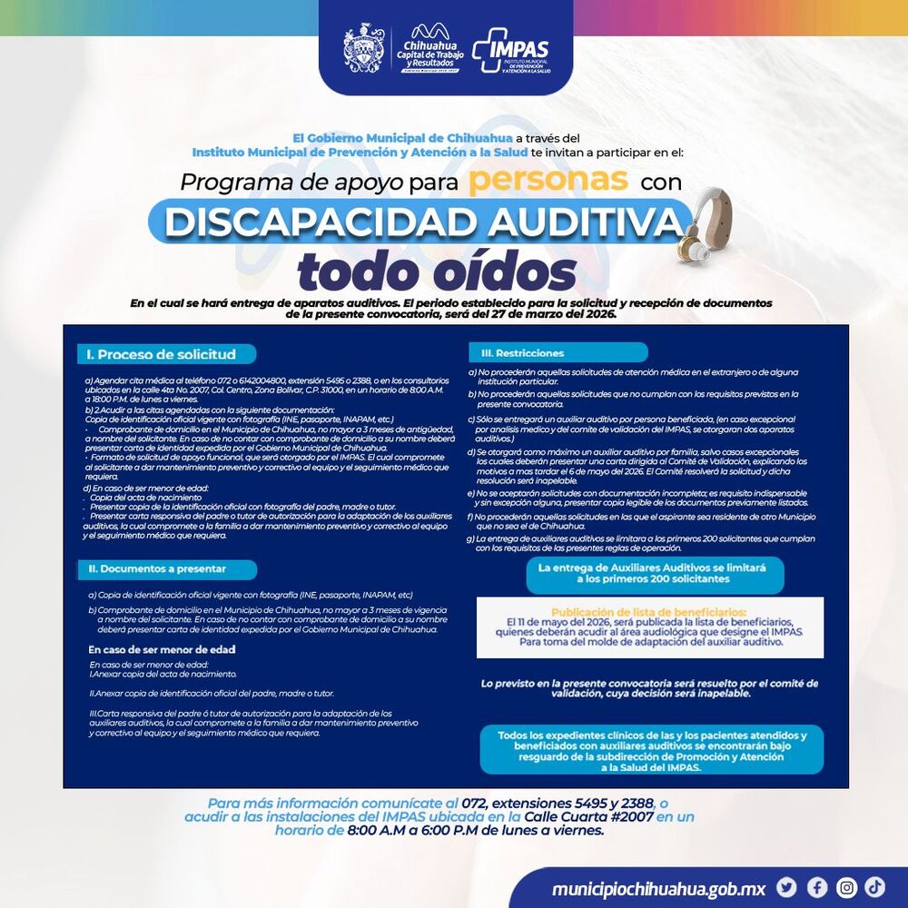 H. Ciudad de Chihuahua, Chih., a 23 de marzo de 2026.- El Gobierno Municipal de Chihuahua, a través del Instituto Municipal de Prevención y Atención a la Salud (IMPAS), recuerda a la ciudadanía que continúa abierta la convocatoria “Todo Oídos”, la cual brinda aparatos auditivos de manera gratuita a personas con discapacidad auditiva.