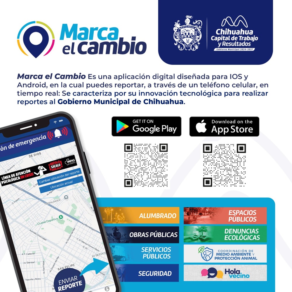 El Gobierno Municipal de Chihuahua, a través de la Dirección de Desarrollo Humano y Educación, recuerda a la ciudadanía que cuenta con canales de atención como la aplicación Marca el Cambio y la línea 072 del Centro de Respuesta Ciudadana (CRC), donde las y los chihuahuenses pueden reportar necesidades en parques y espacios públicos, como instalación de juegos infantiles, mobiliario o mejoras en el equipamiento, además de dar seguimiento a sus solicitudes.