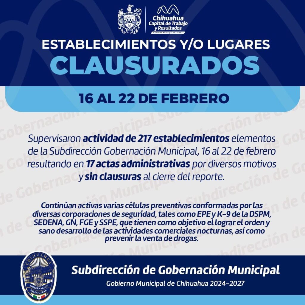 H. Ciudad de Chihuahua, Chih., a 23 de febrero de 2026.- El Gobierno Municipal de Chihuahua, a través de la Subdirección de Gobernación de la Secretaría del H. Ayuntamiento, informa que del 16 al 22 de febrero se realizaron 217 inspecciones a locales y establecimientos.