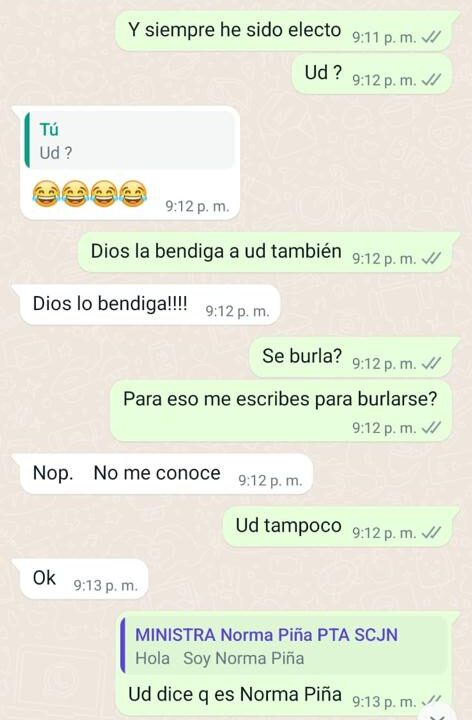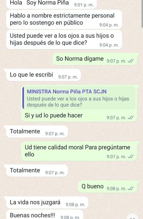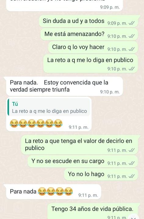 Armenta reclamó que una persona de su equipo recibió mensajes de una persona llamada Francisco Tapia, un supuesto asesor de la Ministra y que se ponía en contacto con ella porque quería comunicarse con él. En dichos mensajes se pueden leer mensajes como: “¿Usted puede ver a los ojos a sus hijos o hijas después de lo que dice?”.