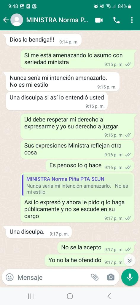 Ahora Armenta dice que Norma Piña lo amedrentó a través de mensajes de Whatsapp.
