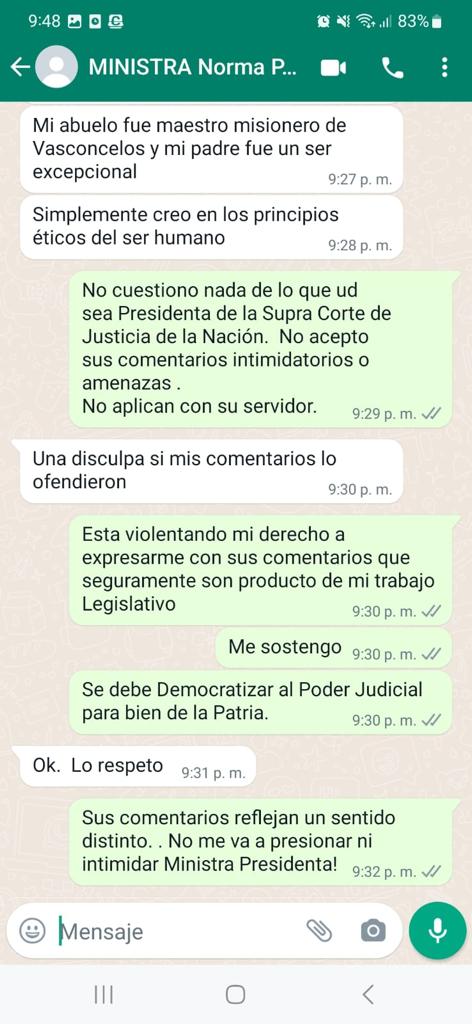 El presidente de la Mesa Directiva comentó que recibió dicha comunicación a nombre de Francisco Tapia, un supuesto asesor de la presidenta de la SCJN. “¿Usted puede ver a los ojos a sus hijos o hijas después de lo que dice?”, se puede leer en los mensajes.