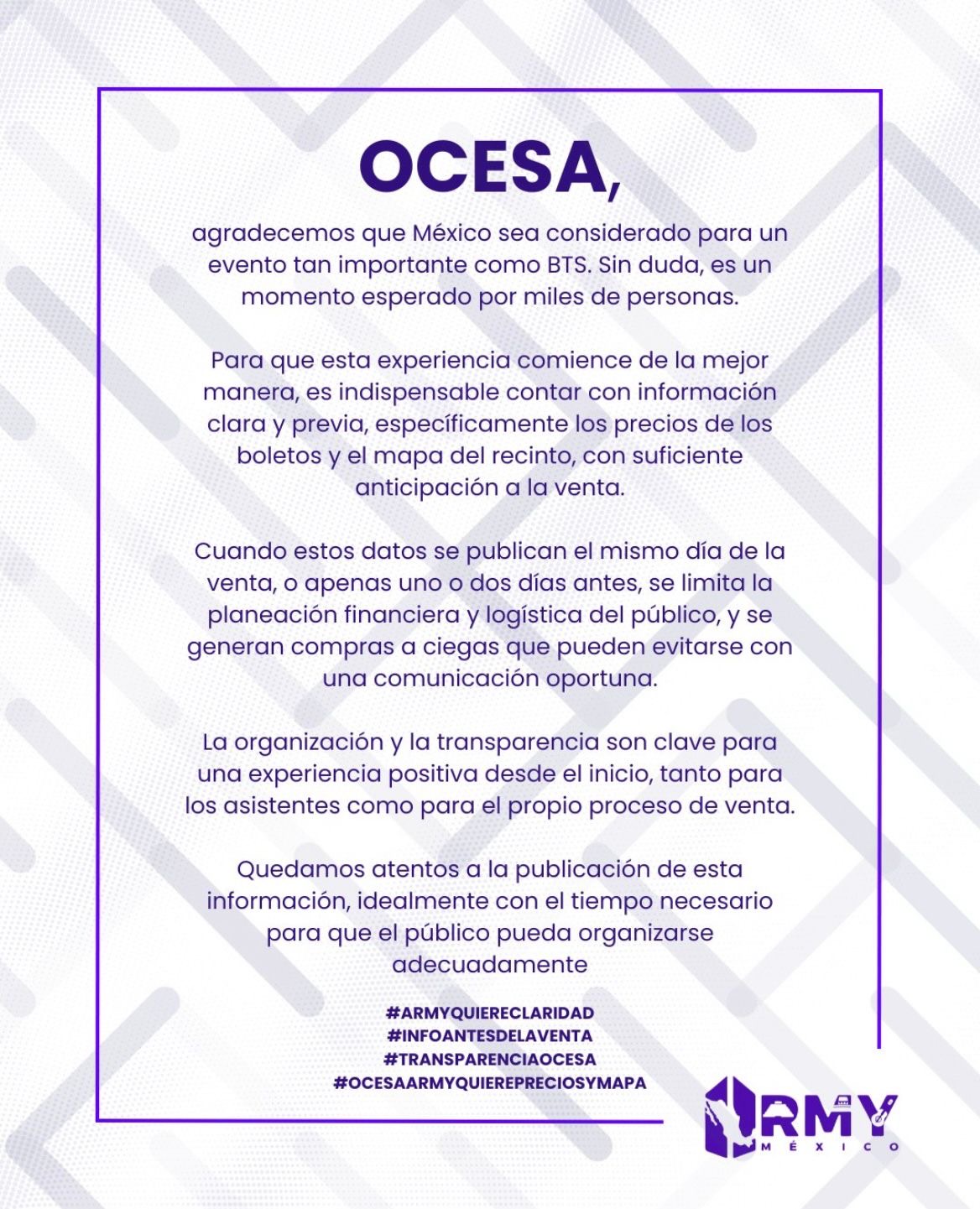 A través de redes sociales, ARMY México difundió un comunicado en el que reconoce la importancia del evento, pero señala que la falta de información previa limita la planeación financiera y logística de los asistentes, además de propiciar compras “a ciegas”. Los seguidores pidieron que los datos se publiquen con suficiente anticipación para garantizar una experiencia justa y ordenada.