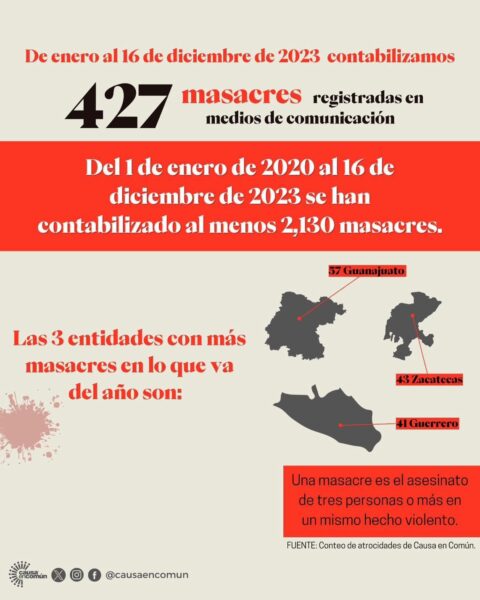 Causa en Común detalló que cada 19 horas se registra una masacre en territorio mexicano.