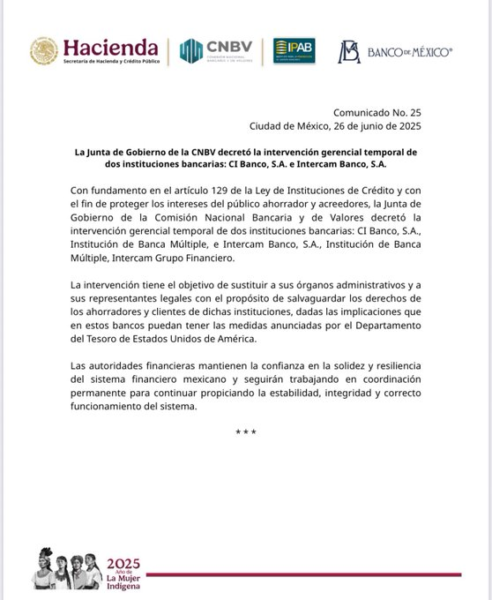 La Junta de Gobierno de la CNBV ordenó la intervención gerencial temporal de CI Banco e Intercam Banco para proteger a ahorradores y acreedores. La medida busca garantizar la estabilidad tras señalamientos del Departamento del Tesoro de EE.UU., según el comunicado oficial de Hacienda