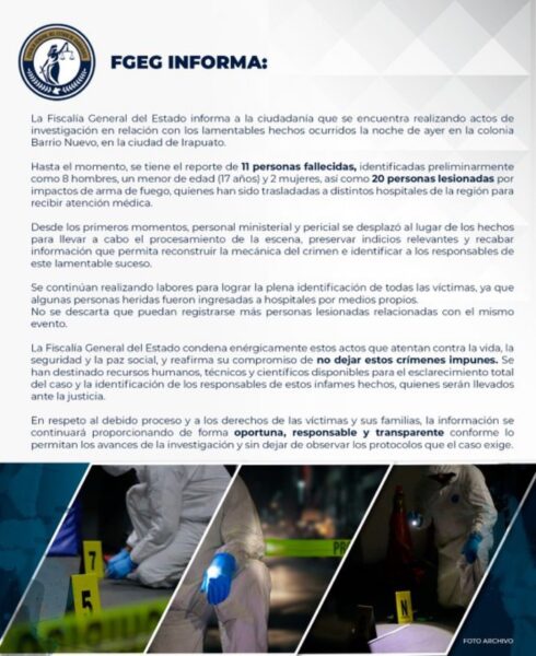 La Fiscalía General del Estado de Guanajuato (FGEG) informó que, hasta el momento, se han confirmado 11 personas fallecidas —entre ellas un menor de edad— y 20 lesionadas por arma de fuego, algunas de las cuales fueron trasladadas por sus propios medios a hospitales de la región. Por su parte, el Gobierno Municipal de Irapuato reportó 12 muertos, lo que ha generado confusión sobre el número real de víctimas.