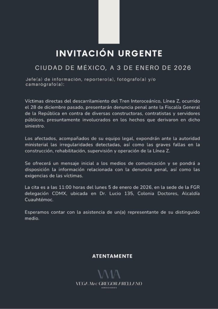 Las víctimas del descarrilamiento del Tren Interoceánico en Oaxaca, ocurrido el 28 de diciembre de 2025, presentarán este lunes 5 de enero de 2026 una denuncia penal ante la FGR. Acusarán a constructoras, contratistas y servidores públicos por presuntas irregularidades en la construcción, supervisión y operación del proyecto, que dejó 14 muertos y casi 100 heridos.