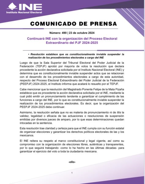 Tras la decisión del TEPJF, el INE confirmó que continuará con la organización del proceso electoral del PJF 2024-2025