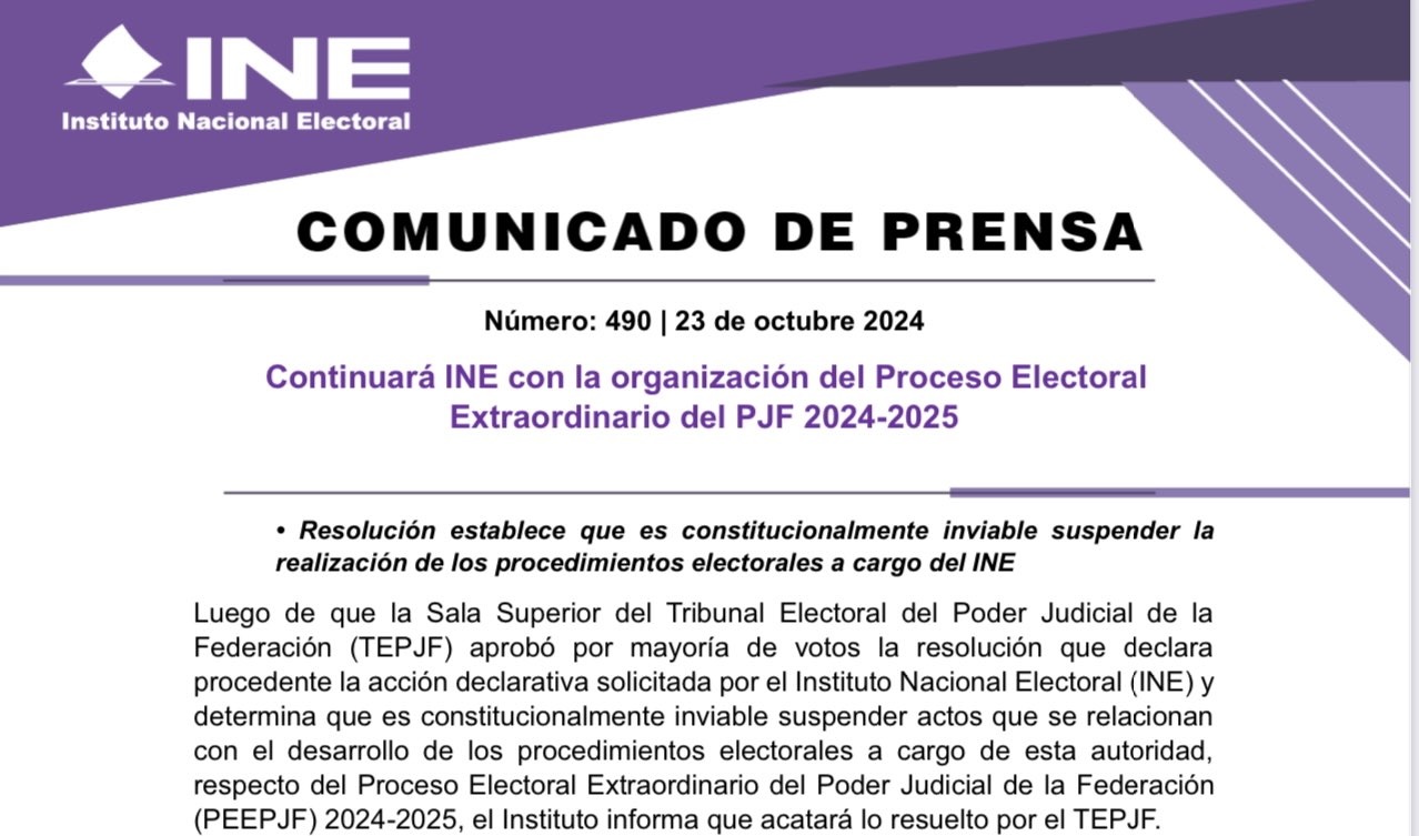 Tras la decisión del TEPJF, el INE confirmó que continuará con la organización del proceso electoral del PJF 2024-2025
