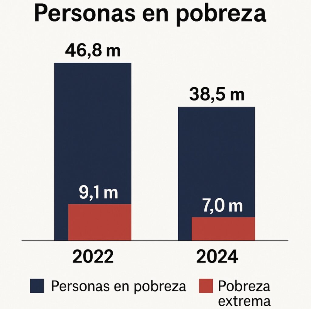 • 2024 (INEGI): La pobreza multidimensional afectó a 38.5 millones de personas, de las cuales 7 millones vivían en pobreza extrema Inegi.