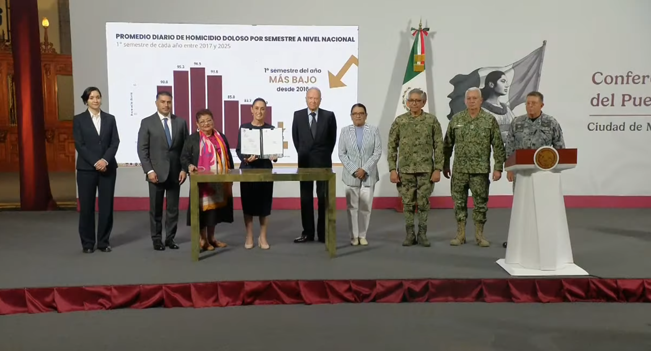 En el ámbito de la seguridad, Sheinbaum destacó una significativa reducción en el promedio diario de homicidios dolosos, con una disminución del 24.5% y un total de 65.6 homicidios diarios. Esta cifra representa el mes de junio más bajo en comparación con junio de 2019. Además, desde 2018 hasta 2025, los homicidios dolosos han bajado un 29.9% a nivel nacional. La presidenta señaló que 25 entidades federativas han reducido el promedio diario de homicidios entre el primer semestre de 2024 y 2025, y que el promedio diario de delitos de alto impacto ha disminuido un 20.2%. También se reportaron reducciones en feminicidios (24.2%) y robos a transportistas con violencia (52.9%), así como una baja del 33.5% en el robo de vehículos, con 98.8 autos robados por día. Sin embargo, alertó sobre el incremento de la extorsión, que ha subido un 27.7%, lo que llevó a la presentación de medidas específicas para combatir este delito.