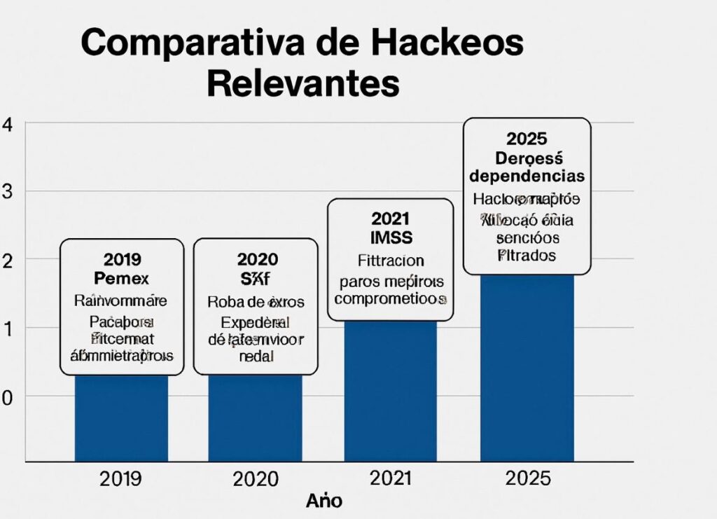 2020–2021: Diversas filtraciones afectaron al IMSS y al SAT, con robo de datos sensibles de contribuyentes y derechohabientes. También se reportaron ataques a gobiernos estatales como Sonora, Querétaro y la Ciudad de México.