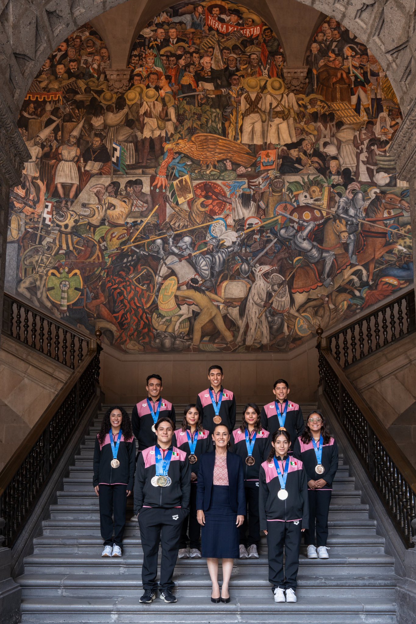 La presidenta Claudia Sheinbaum, recibió en Palacio Nacional a deportistas que participaron en el Mundial de Deportes Acuáticos Singapur 2025.