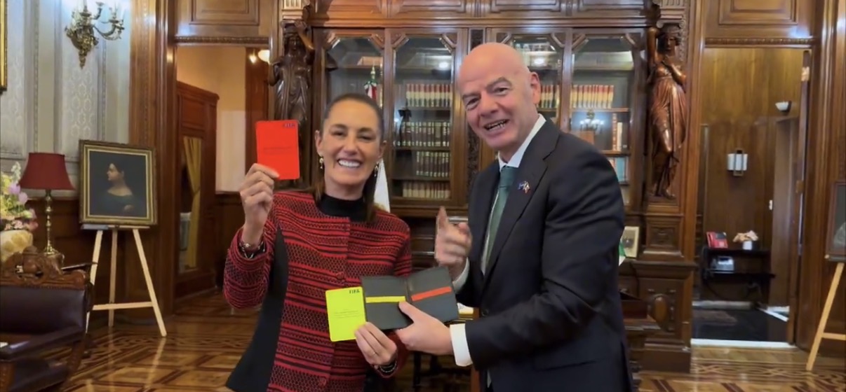 La presidenta de México, Claudia Sheinbaum, sostuvo una reunión con el presidente de la FIFA, Gianni Infantino. Este le regaló a la mandataria nacional las tarjetas roja y amarilla oficiales.