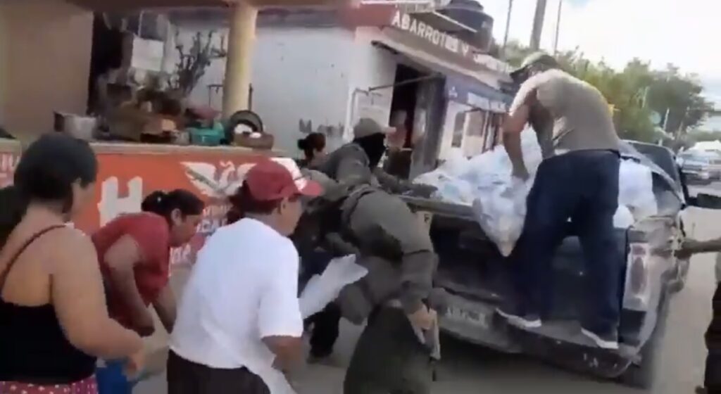 Mientras el gobierno federal y estatal repiten que “solo las autoridades pueden entregar apoyos”, en las calles inundadas de Tihuatlán, los que reparten víveres no llevan chalecos de Protección Civil, sino armas largas y pasamontañas.