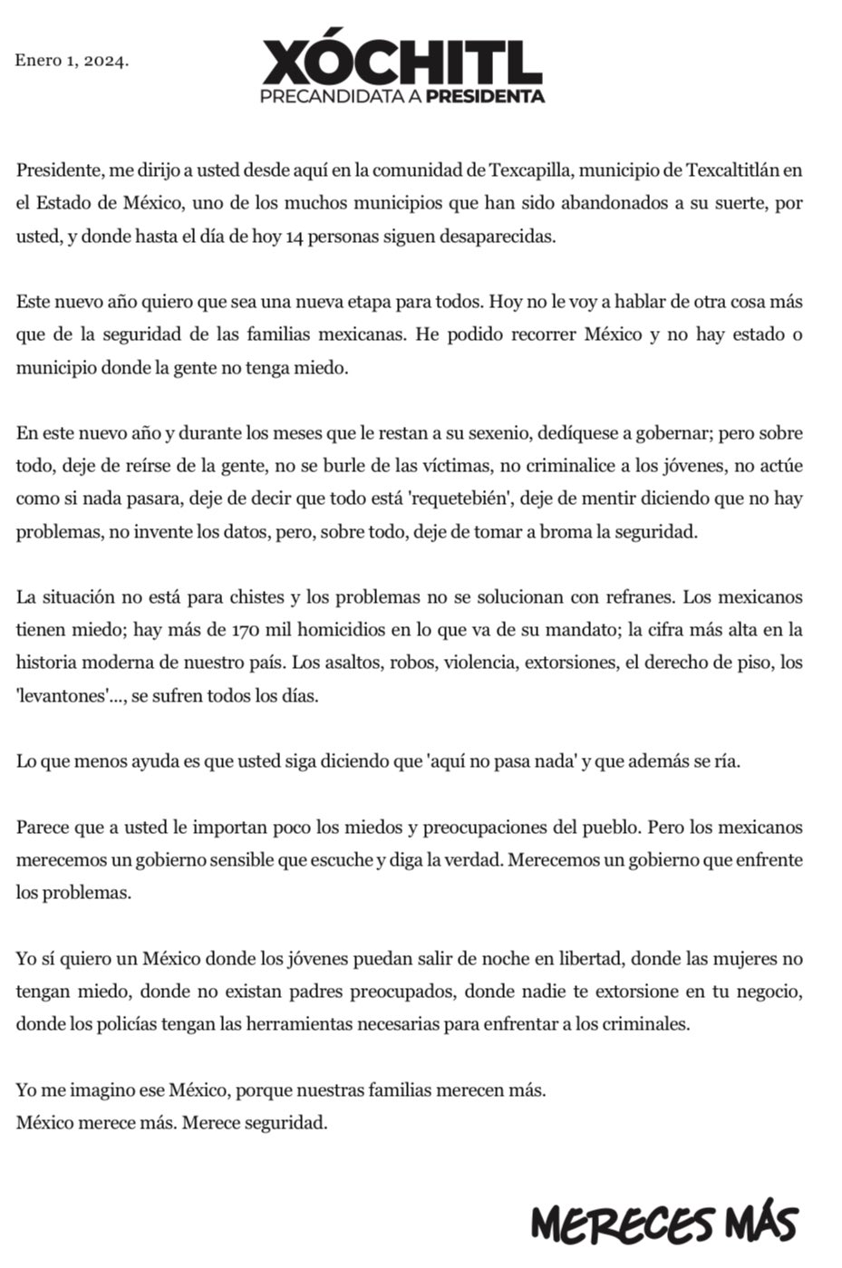 En la misiva, Gálvez señaló que ha podido recorrer México y que no hay estado o municipio donde la gente no tenga miedo. “En este año nuevo y durante los meses que le restan de su sexenio, dedíquese a gobernar; pero -sobre todo- deje de reírse de la gente, no se burle de las víctimas, no criminalice a los jóvenes, no actúe como si nada pasara”, indicó.