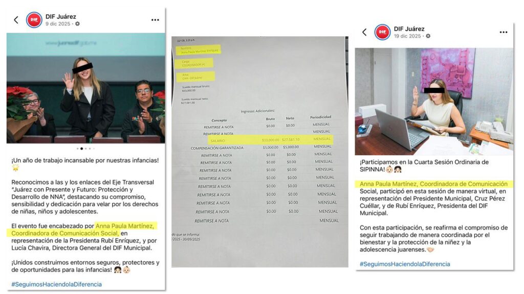 Además, dio a conocer información publicada por la propia dependencia en el Portal de Transparencia, donde Anna Paula Martínez aparece como coordinadora y percibe un sueldo superior a los 30 mil pesos mensuales, así como publicaciones en redes sociales que la muestran desempeñando funciones dentro de dicha institución municipal.