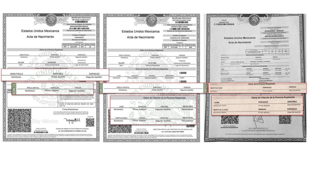 En conferencia de prensa, la dirigente estatal presentó documentos oficiales que acreditan el parentesco de Anna Paula Martínez Enríquez, hija de Perla Cristal Enríquez Parada, hermana de la presidenta del DIF Municipal de Juárez.