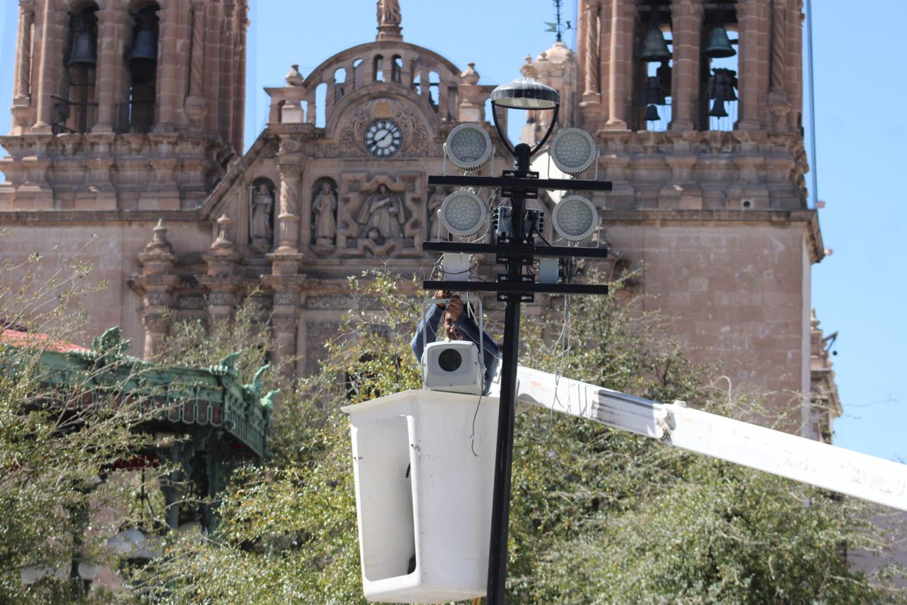 Reinstalan lámparas y proyectores en la Plaza de Armas de Chihuahua