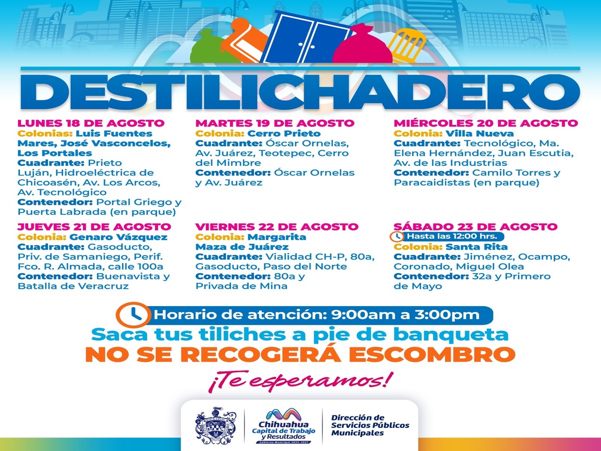 H. Ciudad de Chihuahua., a 19 de julio de 2025.- Para evitar acumulaciones de basura de grandes dimensiones en las viviendas, que podría generar plagas o problemas de salud, el Gobierno Municipal, a través de la Dirección de Servicios Públicos Municipales, informa el calendario del programa Destilichadero, que se realizará [...]