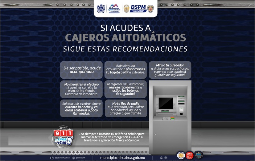 Chihuahua, Chih. 29 de marzo de 2025.- La Dirección de Seguridad Pública Municipal (DSPM) emite recomendaciones para prevenir robos o incidentes en cajeros automáticos, a fin de que acudas con toda tranquilidad y resguardes tu dinero. Aunque dicho delito que no se ha presentado recientemente en la ciudad, la autoridad [...]