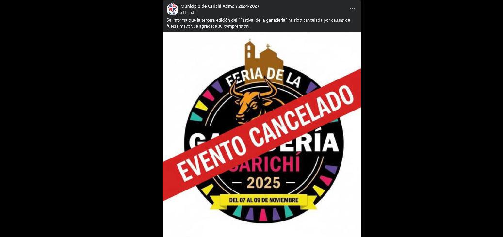 El Ayuntamiento de Carichí ha confirmado la suspensión de la Feria de la Ganadería 2025, un evento tradicional que se había programado para los días 7, 8 y 9 de noviembre. La decisión se tomó ante los recientes incidentes de violencia que han generado un clima de incertidumbre en el [...]